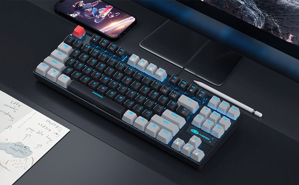 MageGee 75% Qırmızı Düymə ilə Mexanik Oyun Klaviaturası, LED Mavi Arxadan İşıqlandırılmış Klaviatura, Windows Laptop PC Gamer üçün 87 Düyməli Kompakt TKL Simli Kompüter Klaviaturası – Ağ/Mavi